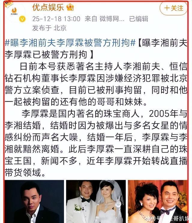 2025年12月18日,一则爆料如同一颗重磅炸弹,炸醒了整个娱乐圈: 李湘前夫、恒信钻石创始人李厚霖,因涉嫌经济犯罪被刑拘! 更令人瞠目的是——他的亲哥哥、亲妹妹,也一并被警方带走。